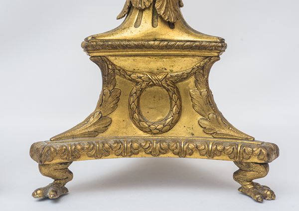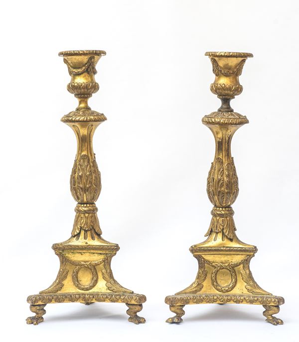 In bronzo dorato finemente cesellato. Poggianti su tre piedi zoomorfi. Corpo centrale decorato a foglie d'acanto e ghirlande, bobeches a foglie di alloro e festoni.