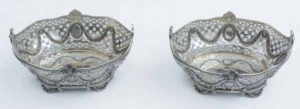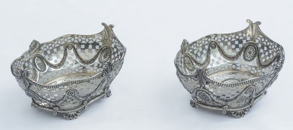 A traforo con bordo perlinato ghirlande esterne sospese a medaglioni, piedi a forma di mezza conchiglia. Peso: 300 gr. ciascuna.