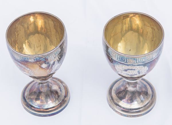 Dorate internamente; bordo superiore decorato con motivo a greca; al centro ghironda con monogramma inscritto "MG". Peso totale: 404 gr.