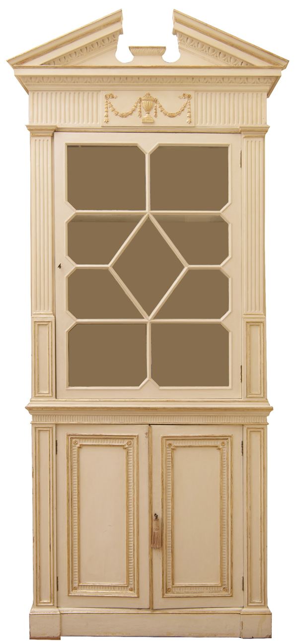 In legno laccato bianco con lumeggiature dorate. Doppia anta inferiore, unica anta a vetro superiore, suddivisa a scomparti. Timpano superiore. Di linea Adams.