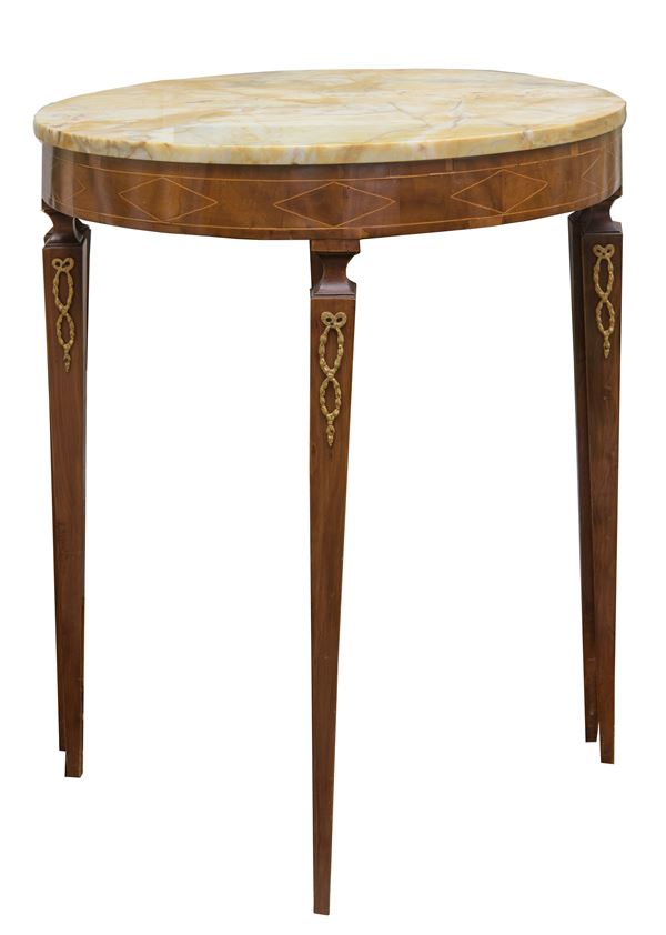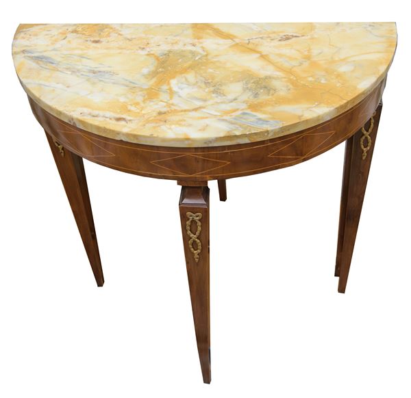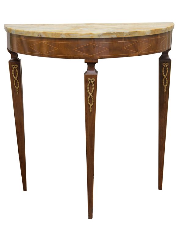 In noce e filettature in bosso. Applicazioni in legno dorato a motivo di fiocco e ghirlande. Piano superiore in marmo giallo di Siena.