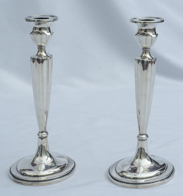 Con stelo sagomato e base circolare liscia, bacchetta portacandele a forma di coppa. Peso: 500 gr ca. ciascuno.