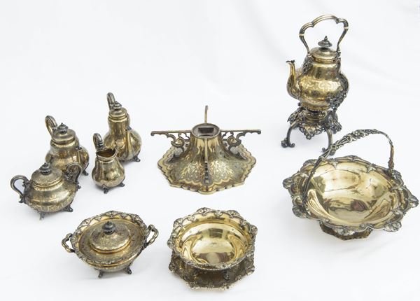 Il servizio, decorato con motivi vegetali, conta 9 elementi ed è così composto: un samovar; un cestino ansato con bordo sagomato; un contenitore con coperchio; una coppa rialzata; una zuccheriera con coperchio; una lattiera; una cioccolatiera; una caffettiera; un'alzata. Recanti il marchio di Mark Augustin Lebrun. Peso complessivo: 7.400 gr.