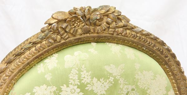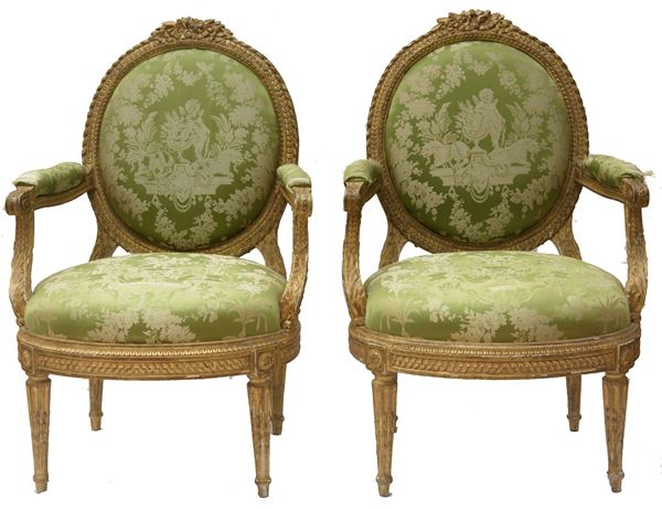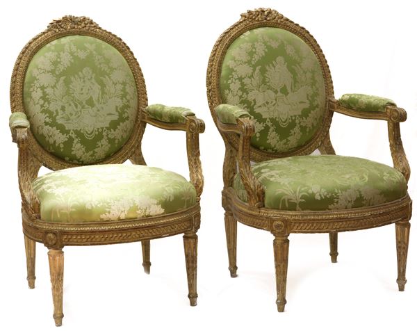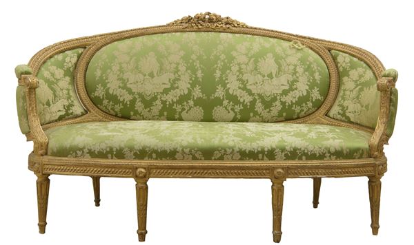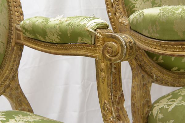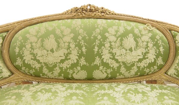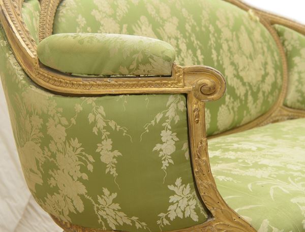 Composto da un canapé a corbeille e due poltrone in legno dorato e riccamente intagliato. Il canapé poggia su sei gambe rastremate con scanalature rudenti, con schienale ovale imbottito e fianchi ricurvi, a quattro ordini di intaglio, foglie di acanto e boccioli. La coppia di poltrone a medaglione, poggiano su quattro piedi rastremati e scanalati. Schienale, seduta e braccioli imbottiti con rivestimento in seta verde-grigio con decorazioni floreali ed amorini. Stampigliatura "Parmantier a Lyon" sul canapé e su una poltrona.