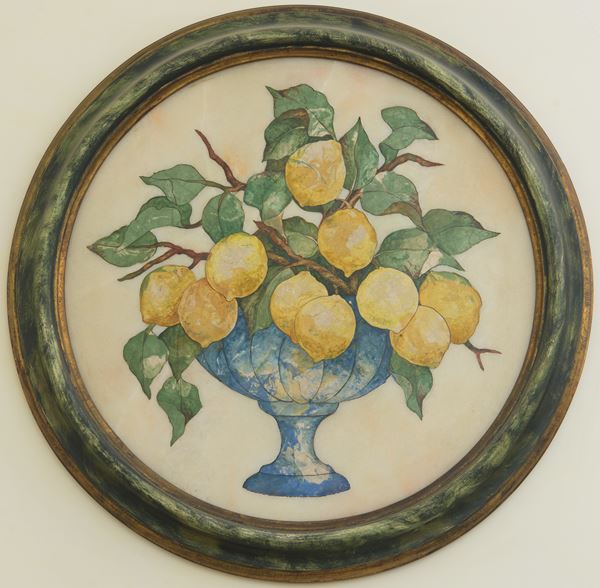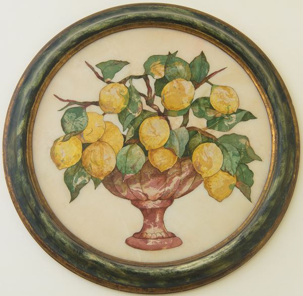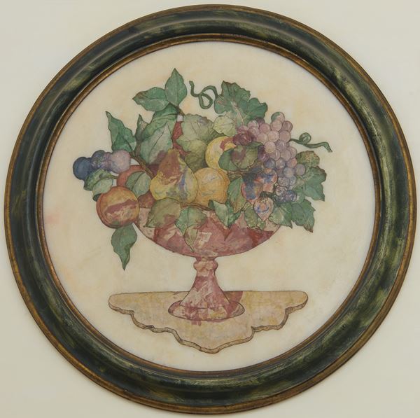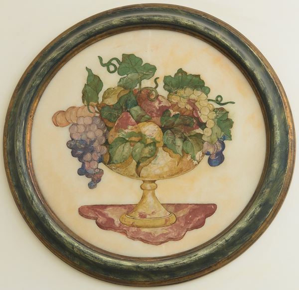 In scagliola, raffiguranti coppe di frutta entro cornice circolare verde a finto marmo.