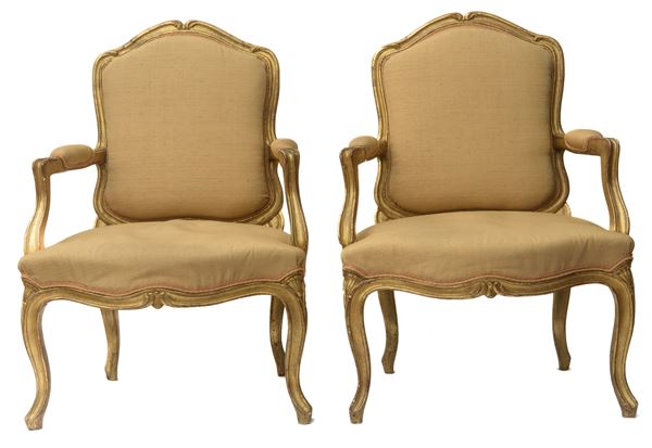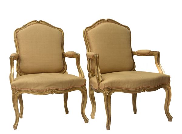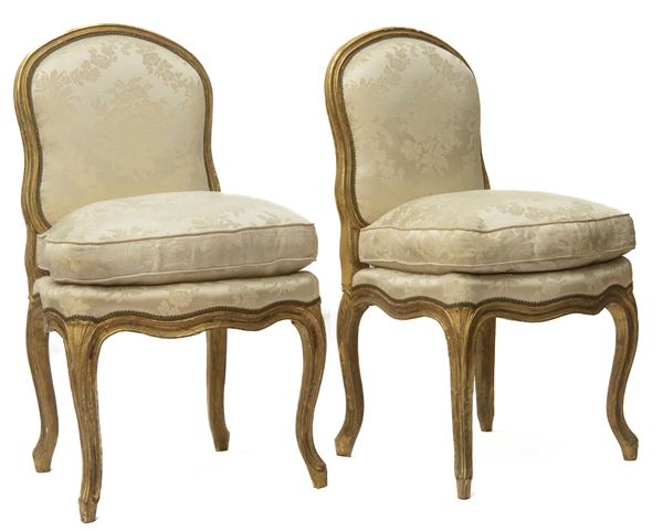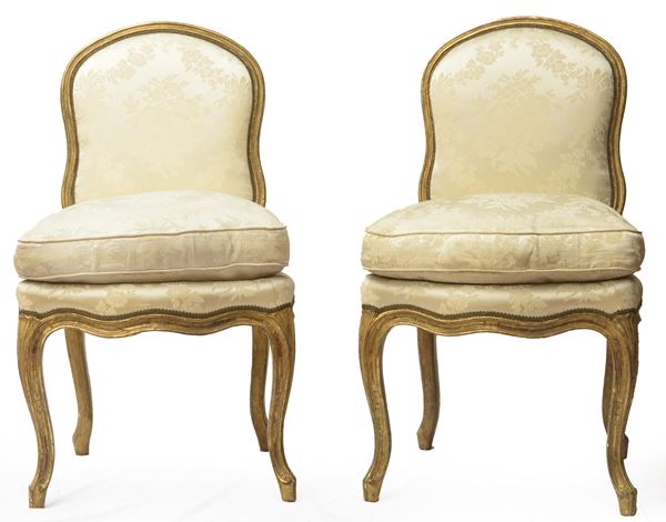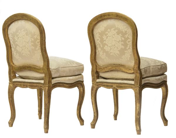 In legno dorato, con sedute e schienali, sagomati e tappezzate. Gambe leggermente ricurve.