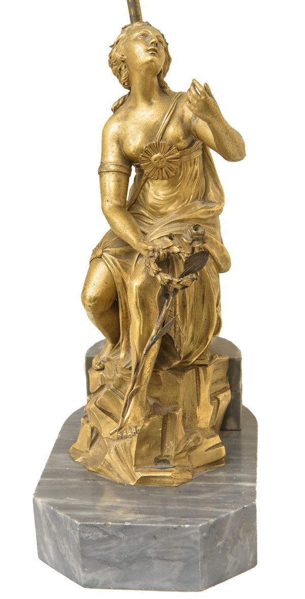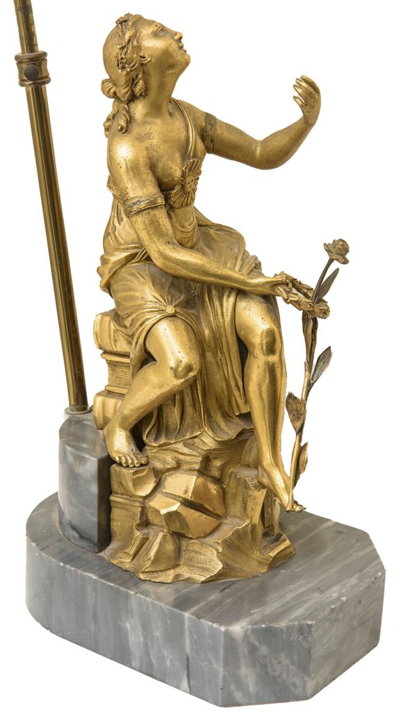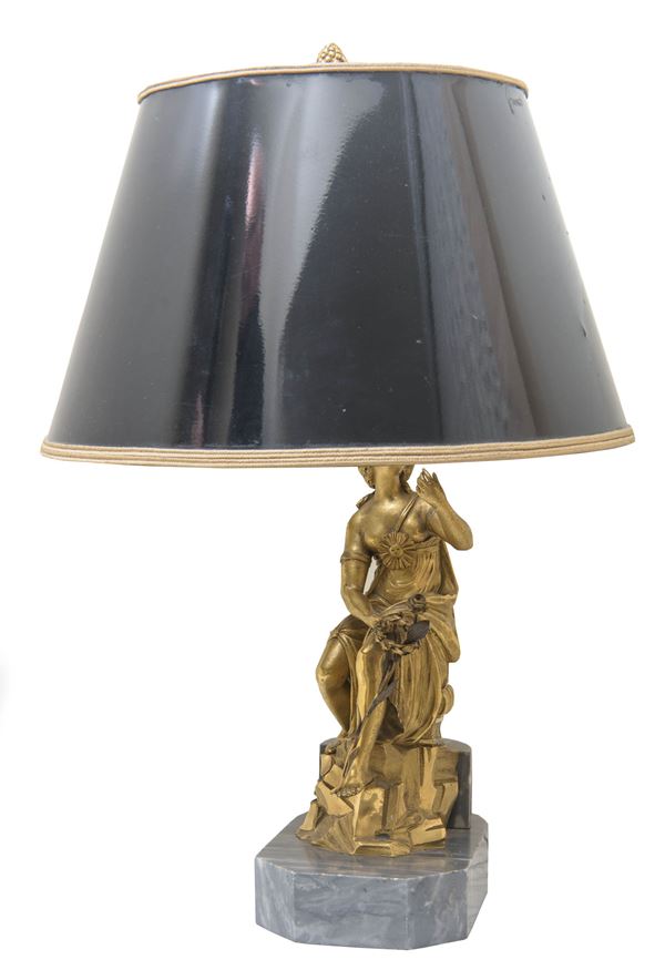 In bronzo dorato su basamento in marmo bardiglio. Adattata a lume da tavolo.