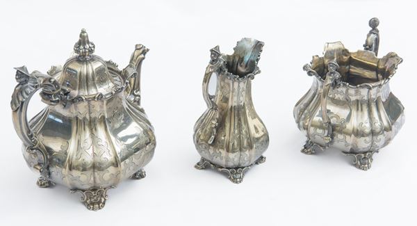 Epoca William I. Composto da teiera( H. 22 x 21 cm), peso: 824 gr; zuccheriera, peso: 434 gr.; lattiera, 228 gr. Decorati con motivi stilizzati, sul manico teste di uomo con copricapo a pagoda.