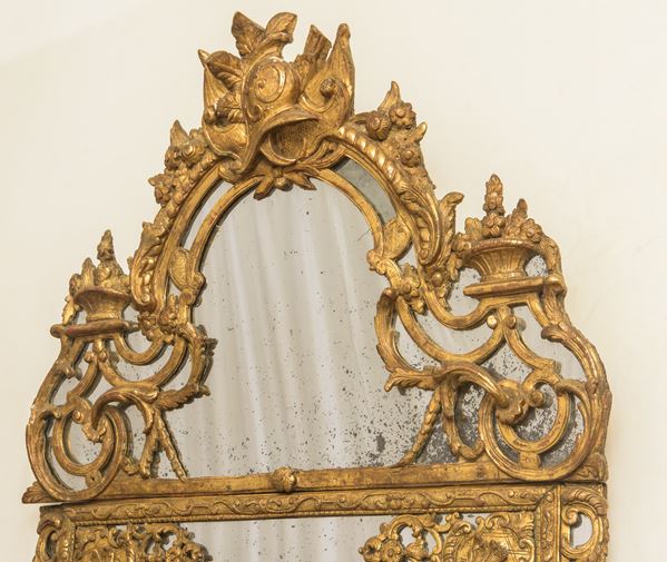 In legno dorato e finemente intagliato. Specchio d'origine a mercurio inserito in una doppia cornice riccamente intagliata a decorazione floreale e a tralci fogliacei. La parte superiore, composta da una grande cimasa a ghirlande e racemi, arricchita da due cesti di fiori, sormontata da un grande elmo e faretra. Presenta un piccola rottura allo specchio a destra nel registro inferiore.