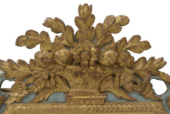 In legno dorato e finemente intagliato. Specchio originale a mercurio inserito in una cornice fiancheggiata da decorazioni a motivi vegetali e floreali. La ricca cimasa con una grande paniera di fiori, foglie e melograni sovrasta le linee dritte laterali.