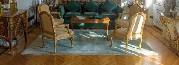 In lana color verde Celadon. Fascia ornamentale a greca perimetrale e decoro centrale.