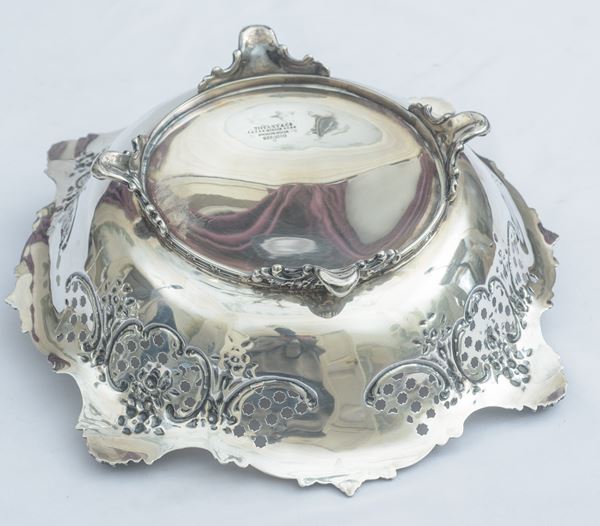 Con motivo traforato a canneté e decorato con tralci di fiori e conchiglie; poggiante su quattro piedini sagomati. Peso: 1102 gr.