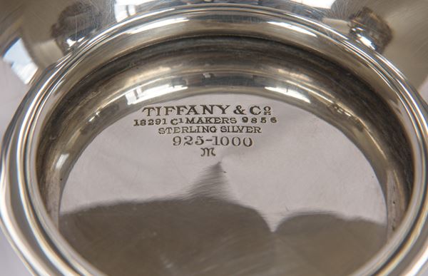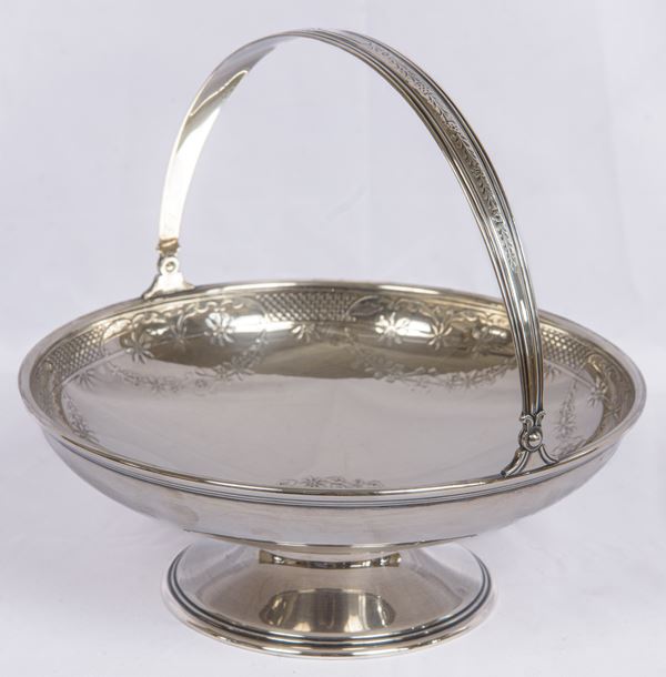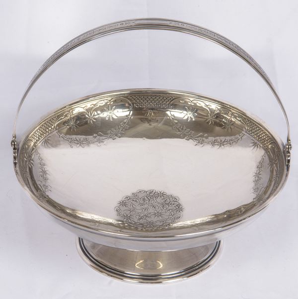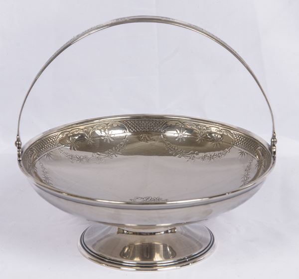 Ansato con coppa interna liscia con decori floreali nei bordi e nel centro. Peso: 504 gr.