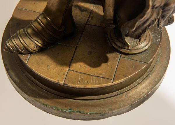 In bronzo brunito, firmato al fronte della base. Con basamento circolare in pietra.