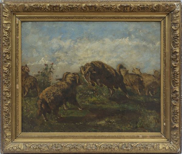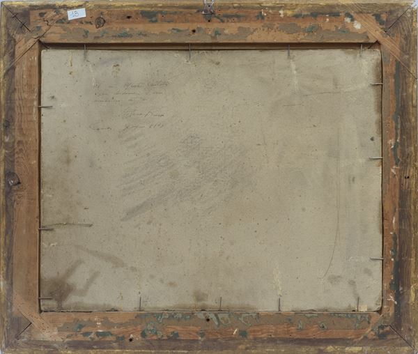 Firmato, titolato e dedicato al retro "Al mio maestro Castelli con devozione il suo umilissimo ... Stefano Bruzzi - Roma giugno 1898". Entro cornice in legno dorato di epoca coeva.