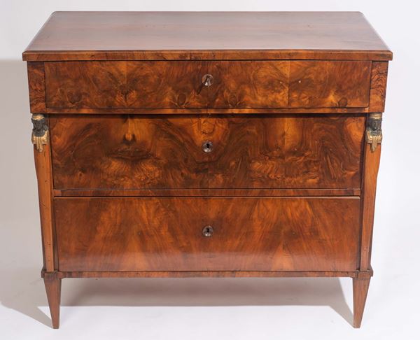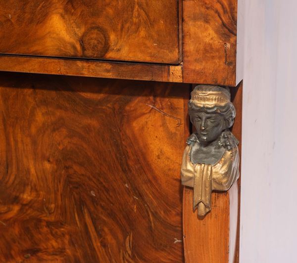in legno di noce e radica di noce. A tre cassetti con due lesene con cariatidi in legno dorato e brunito
