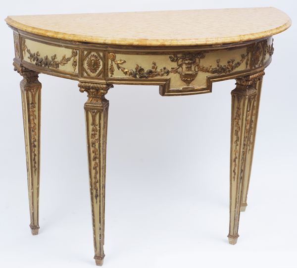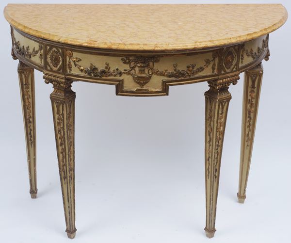 In legno laccato con parti intagliate e argentate. Quattro piedi rastremati. Piano superiore in marmo giallo di Verona. Stile Luigi XVI. Difetti e mancanze