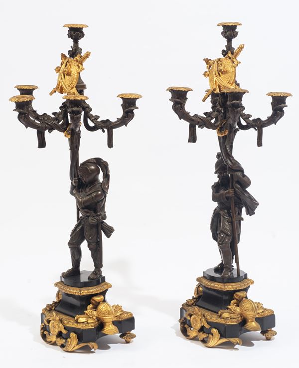 A cinque bracci, con figure di armigeri in bronzo brunito basamento in bronzo dorato e marmo nero del Belgio.
