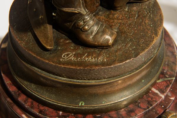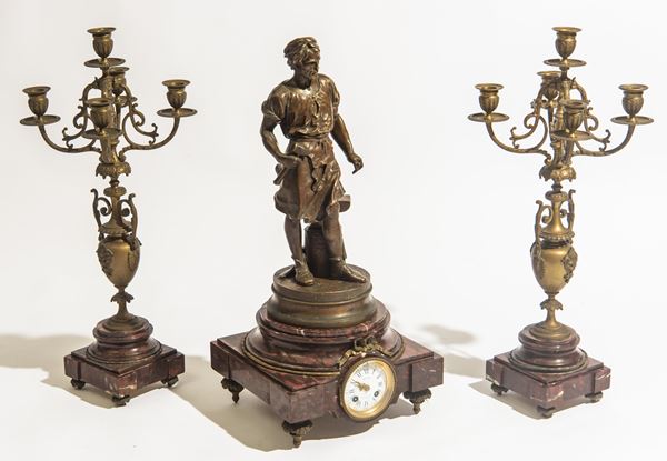 Composto da: un orologio e due candelieri a cinque fiamme, basamento in marmo rouge griotte. Meccanica firmata: "Richond - Boulevard Montmartre".  Dimensioni: orologio  H. 60 x 25 x 28 cm; candelieri H. 60 x 13 x 13 cm.