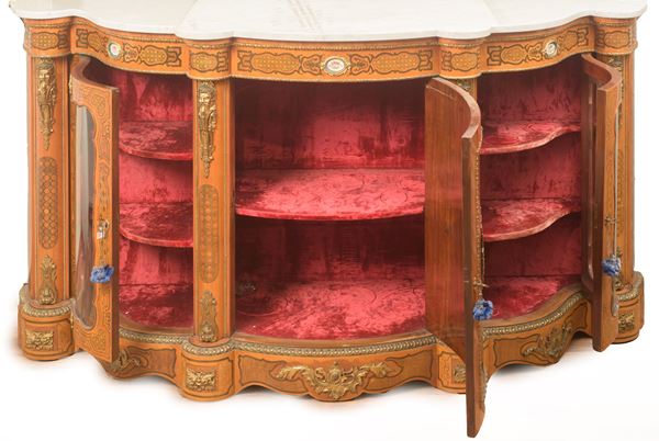 In legno di acero, ebano, palissandro e legni vari di frutto intarsiati a motivi floreali e a marchetteria e applicazioni in bronzo dorato. Due sportelli laterali vetrati; sportello centrale con placca in porcellana di Sevres. Piano superiore in marmo bianco di Carrara