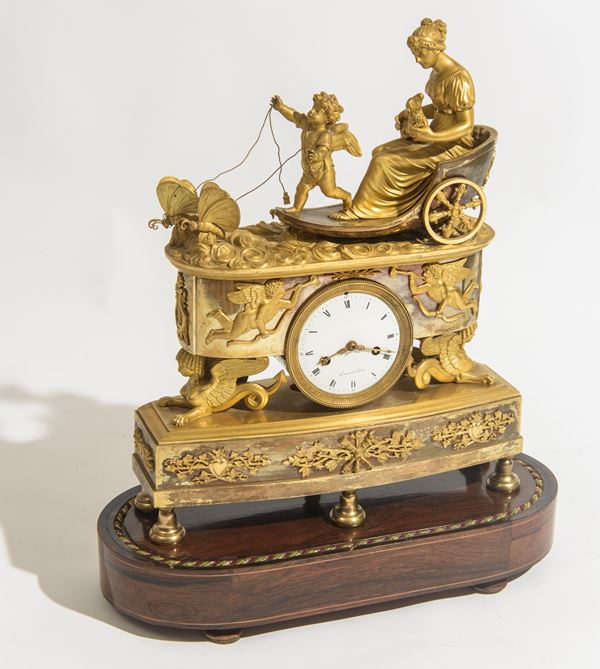 In bronzo dorato, quadrante firmato "Durand à Paris". Su base in legno.