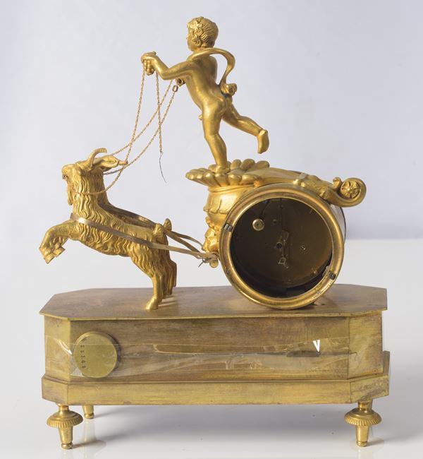 in bronzo dorato finemente cesellato, corpo centrale con biga, sormontata da bacchino. Quadrante traforato con meccanica a vista e numeri romani smaltati, firmato 'M. Gentilhomme palais royal'. Meccanica da revisionare.