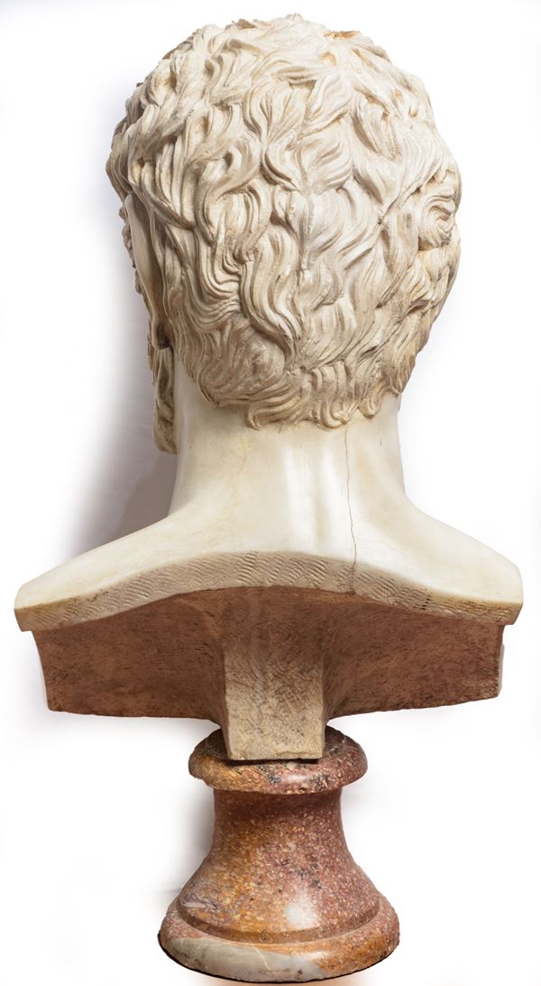 Scultura in marmo bianco statuario. Poggiante su basamento in marmo breccia di Aleppo.