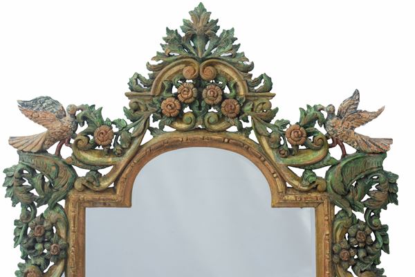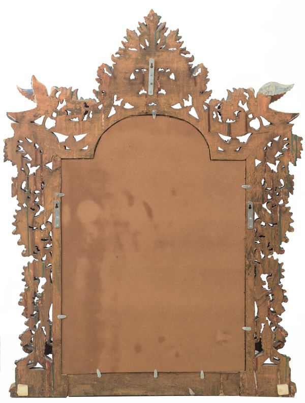 In legno intagliato e decorato a motivi floreali e volatili.