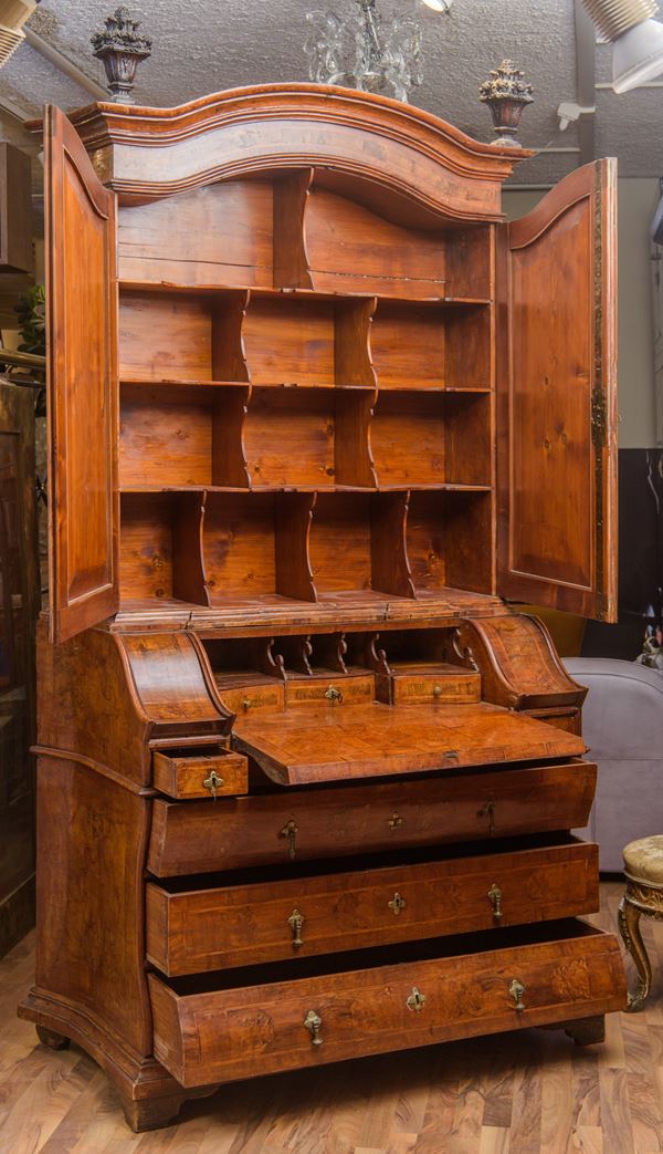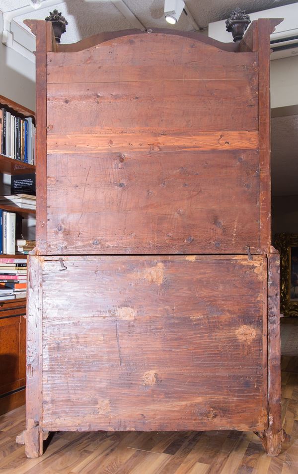 a due corpi in noce e radica di noce, con basamento composto da fronte concavo a tre cassetti con spallette superiori apribili, due cassettini superiori e ribalta con cassettiera interna. Fianchi svasati. Corpo superiore a due ante con ampia cimasa superiore