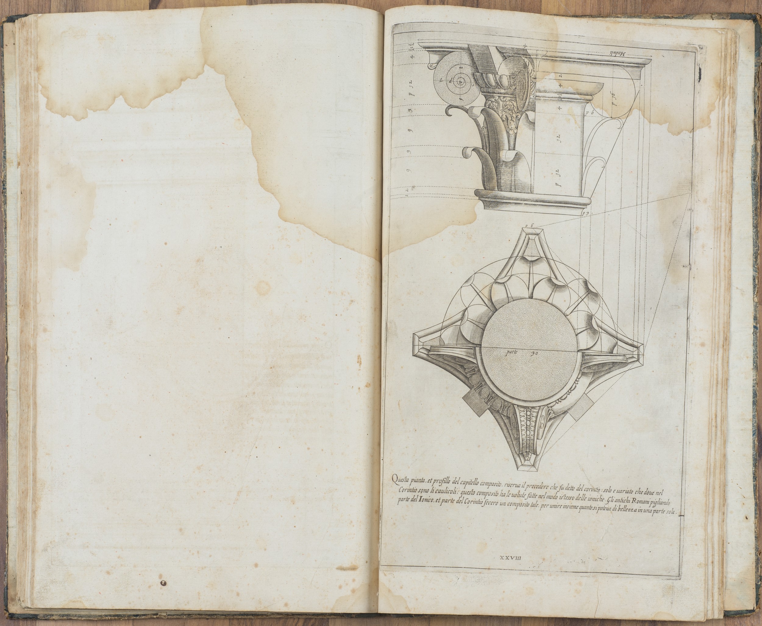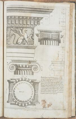 Parte prima, due frontespizi con la tavola con dedica a Volunio Bandinelli e la prefazione. Contenente 37 tavole , relative ai cinque ordini, alle porte e a un camino. Restauri per strappi, aloni e fioriture. Legatura successiva.