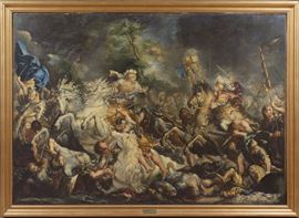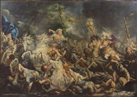 L’opera mostra evidenti influenze giordanesche, riconoscibili nella luminosità dei bianchi, nella scioltezza della pennellata e nell’energia delle torsioni. Tuttavia, la composizione tradisce una matrice decisamente nordica, evidente nella cura dei dettagli equestri, nella resa del paesaggio e nella coralità dell’insieme. Non è estranea, inoltre, una vicinanza alle invenzioni di Salvator Rosa, specialmente nella drammaticità del cielo e nell’enfasi tragica del combattimento.