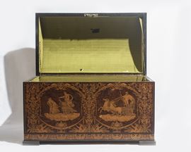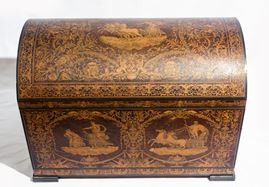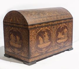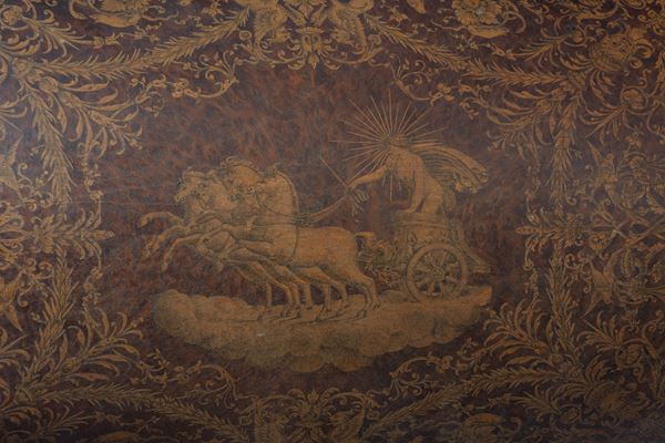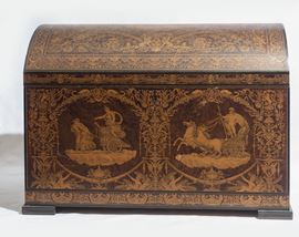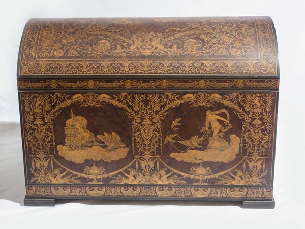 in radica di tuja con filettature in ebano e riccamente intarsiato in bosso pirografato, con motivi ornamentali floreali, carri allegorici e maschere a grottesca. Usure e mancanze.
