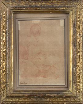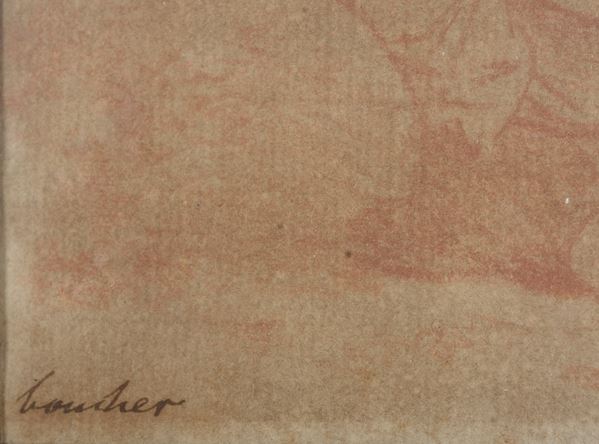 Il foglio raffigura una giovane figura seduta di tre quarti, con il busto leggermente inclinato e le gambe raccolte. L’impianto è semplice e immediato, concentrato sulla resa della postura e sull’andamento dei panneggi, lasciati con tratto rapido e vaporoso. Il volto, appena accennato, e il segno morbido a sanguigna, con variazioni di intensità e sfumature, rivelano il tipico modo grafico di François Boucher, che fece della sanguigna il suo mezzo preferito per gli studi di figura.