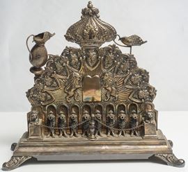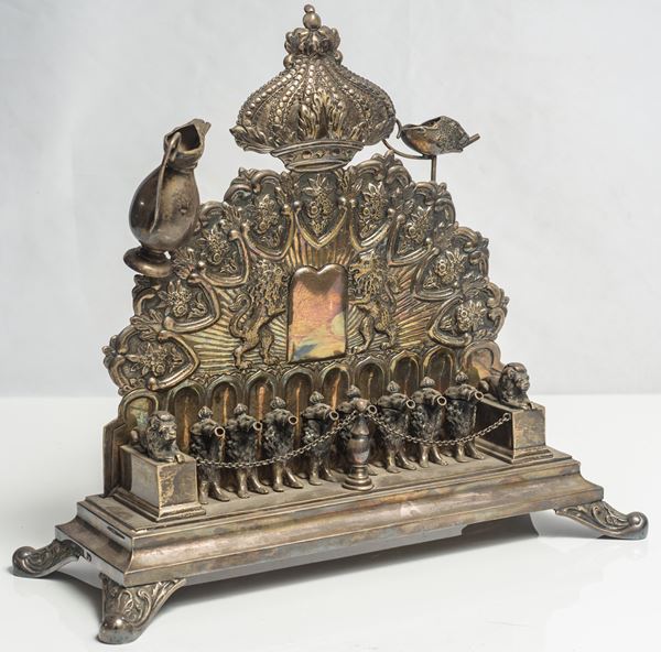 Otto portacandele entro il basamento. Lampada utilizzata per celebrare la festa ebraica di Hannukkah.