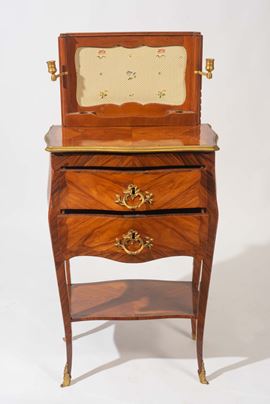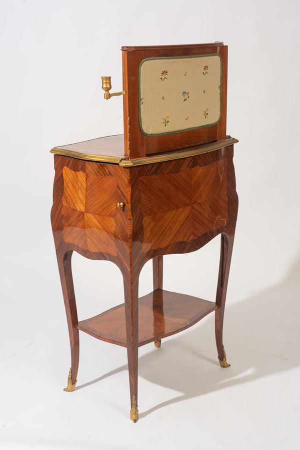 In ebano viola, ebano rosa e applicazioni in bronzo dorato. Due cassetti centrali con piano superiore scorrevole e ripiano interno a scomparti.