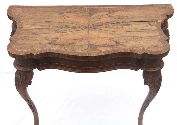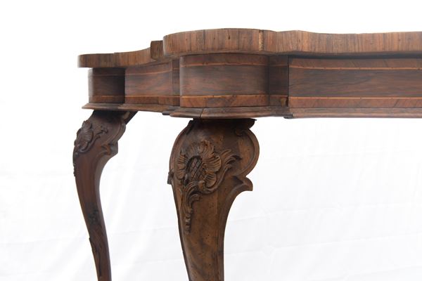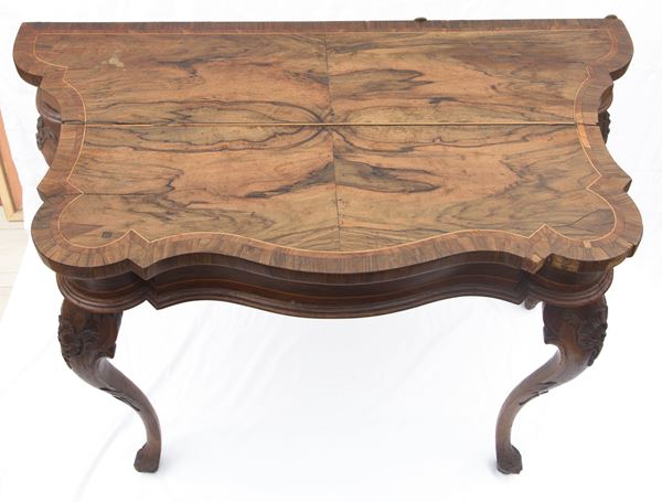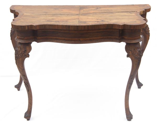 Fascia e piano sagomati, lastronati in noce e radica di noce, cassetto sul fronte.. Gambe mosse e intagliate a volute, arcuate terminanti con piedi zoomorfi. Restauri e mancanze.