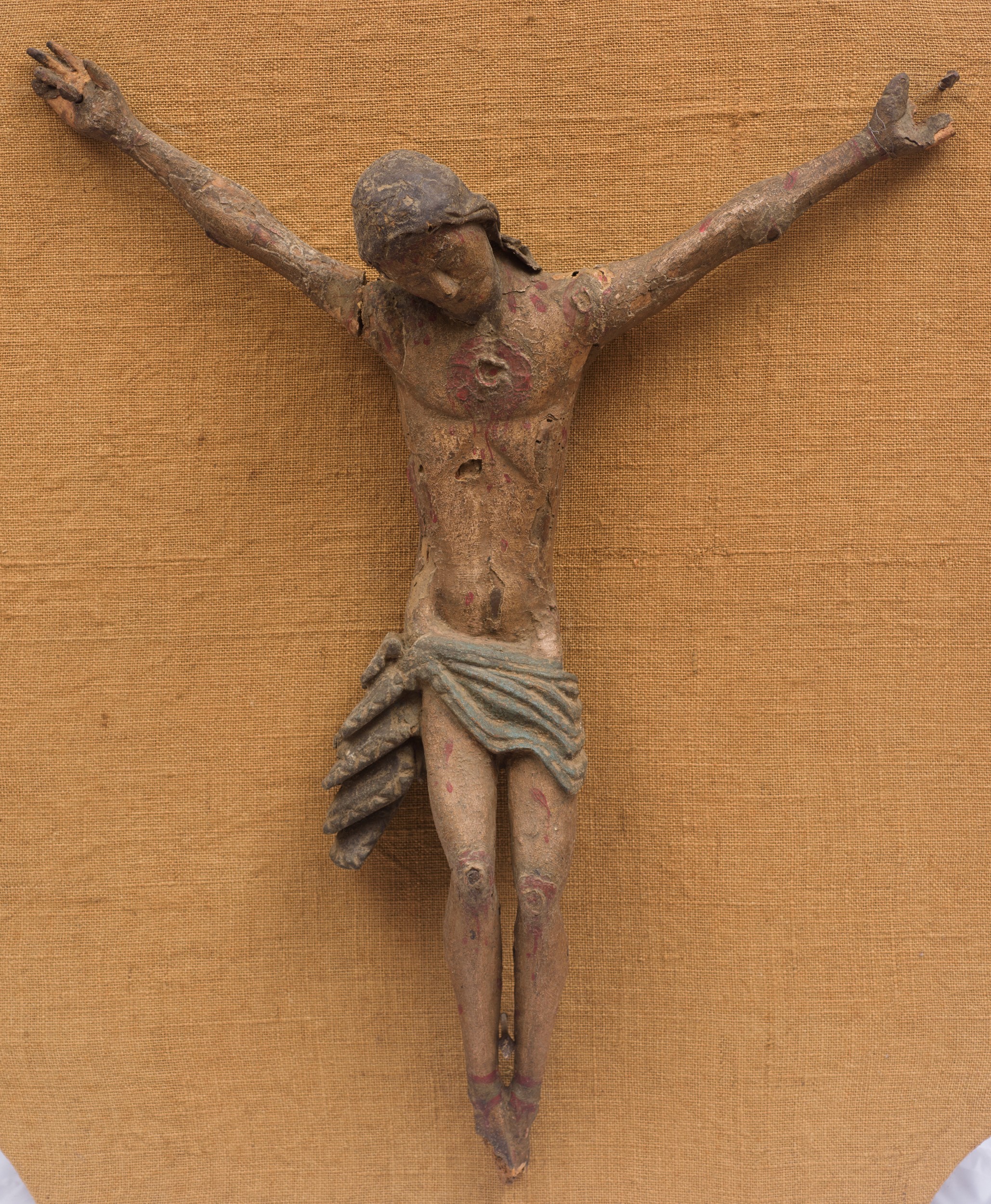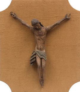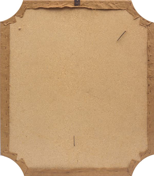 scultura in legno di frutto policromo Applicato su pannello in compensato moderno. Mancanze e usure.