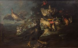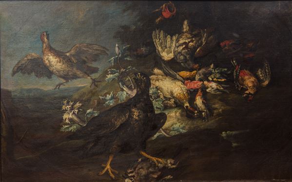 La coppia di dipinti raffigura ricche composizioni di selvaggina da penna, raffigurata con gusto scenografico e naturalistico. In una tela fagiani, anatre e altri uccelli sono disposti sospesi e a terra, ambientati in un paesaggio crepuscolare; nell’altra, la disposizione è più articolata e dinamica, con pernici, galli cedroni, fagiani e piccoli volatili accostati a vegetazione e fiori. Le tele mostrano la caratteristica attenzione al piumaggio, la varietà cromatica e la costruzione teatrale delle scene, tipiche della produzione di Angelo Maria Crivelli, artista che si impose nella Milano tardo-seicentesca e nei primi decenni del Settecento come uno dei maggiori specialisti lombardi della natura morta venatoria, spesso eseguita in coppie o cicli destinati a dimore nobiliari e di campagna. In cornice.