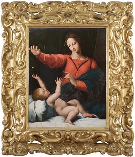 Quest'ultima, ora considerata in maniera definitiva come il prototipo della madonna raffaellesca, non sempre ha goduto della stessa fortuna attribuzionistica. Adolfo Venturi, nella sua monografia su Raffaello del 1935, considerava proprio la Madonna di Light Court qui presentata come "l'originale di tante imitazioni della madonna che, al tempo napoleonico, sparì dalla Basilica lauretana". E dello stesso parere furono, dopo di lui, Bernard Berenson, Georg Gronau, Roberto Longhi e Federico Zeri. Anche Maurizio Marini, in un'expertise del 21 Marzo 2001, sostiene questa tesi portando come primario termine di confronto le dimensioni del dipinto in catalogo: rispetto alle misure della tavola di Chantilly, quelle del dipinto qui presentato sarebbero più prossime al suo probabile pendant, il Ritratto di Giulio II conservato oggi alla National Gallery di Londra. Inoltre, le cromie intense, l'utilizzo di colori molto costosi e l'alta qualità dell'opera inducevano lo studioso a definire l'opera di autografia totalmente raffaellesca, in particolare per la trasparenza del velo e per lo straordinario timbro madreperlaceo dei bianchi.