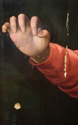 In questa sede, più prudenzialmente, si attribuisce l'opera alla bottega di Raffaello, nonostante le indagini diagnostiche, tra cui la riflettografia a infrarossi e i raggi X rivelino diversi pentimenti, condotti da mano così sicura tale da far propendere per una stesura disegnativa compiuta da un grande Maestro, più che da allievi di bottega.