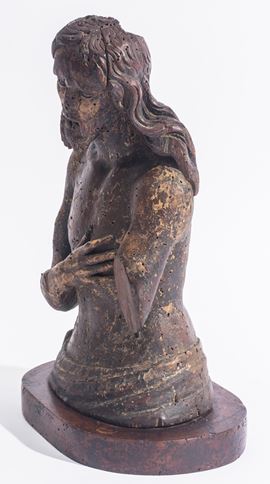 scultura in legno di frutto, su base ovale lignea successiva. Tracce di policromia d'origine. Difetti e mancanze