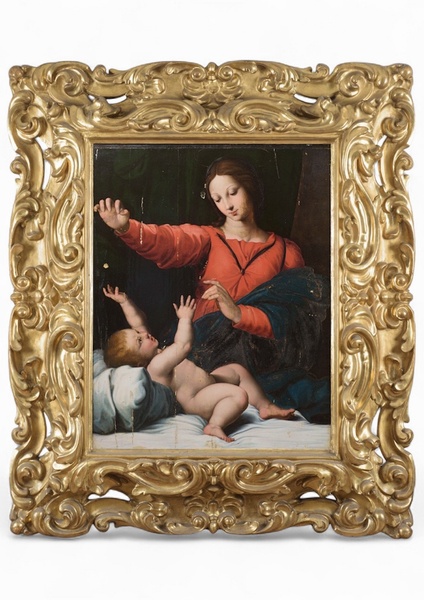 La piccola tela raffigura la Vergine seduta in contemplazione del Bambino, che giace tra le sue braccia su un [..], olio su tela, 54 x 40 cm