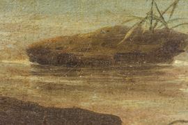 La monumentale tela raffigura un paesaggio lacustre con una quinta arborea al centro e sulla destra, da cui si apre un’ampia veduta su un orizzonte collinare. L’opera, firmata e datata “1776”, appartiene alla fase romana di Jacob Philipp Hackert, uno dei più importanti paesaggisti internazionali della seconda metà del XVIII secolo, prima della sua definitiva affermazione alla corte borbonica di Napoli.