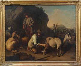 La tela raffigura una vivace scena di vita pastorale: in primo piano un pastore munge una capra, osservato da un compagno in piedi presso un gregge di pecore, accovacciate all’ombra di una roccia. Sullo sfondo si apre un paesaggio collinare con accenni di vegetazione, definito con toni caldi e luminosi.