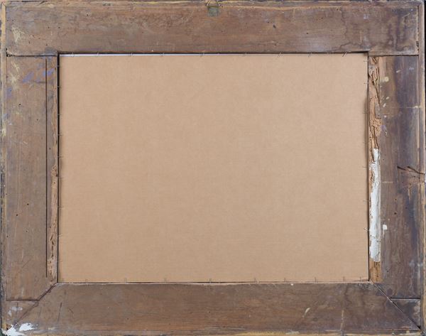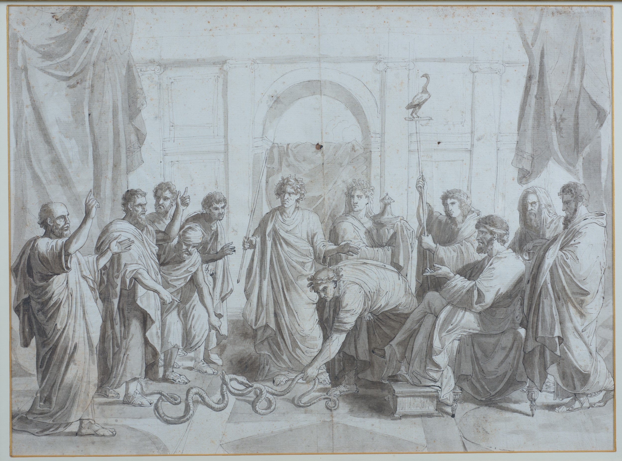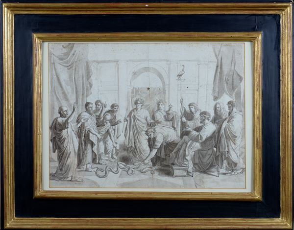 Il foglio raffigura un episodio biblico, probabilmente il confronto tra Mosè e gli incantatori del Faraone, colti nel momento in cui i bastoni si trasformano in serpenti. La scena è ambientata in un grandioso interno architettonico scandito da arcate e drappi, e popolata da numerose figure disposte su due registri. La composizione ordinata, l’uso calibrato del chiaroscuro e la resa classicheggiante dei panneggi e delle anatomie collocano il disegno nell’ambito della cultura neoclassica italiana o francese dei primi decenni del XIX secolo. Entro cornice.