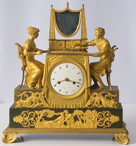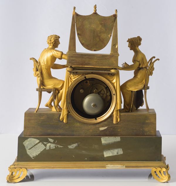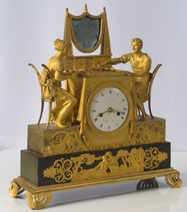 in bronzo dorato, brunito e finemente cesellato. Quadrante smaltato con numeri romani, firmato 'Simon à Paris'. Corpo centrale sormontato da psiche, con due figure intente nel gioco della dama. Basamento in bronzo dorato e brunito. Meccanica da revisionare.