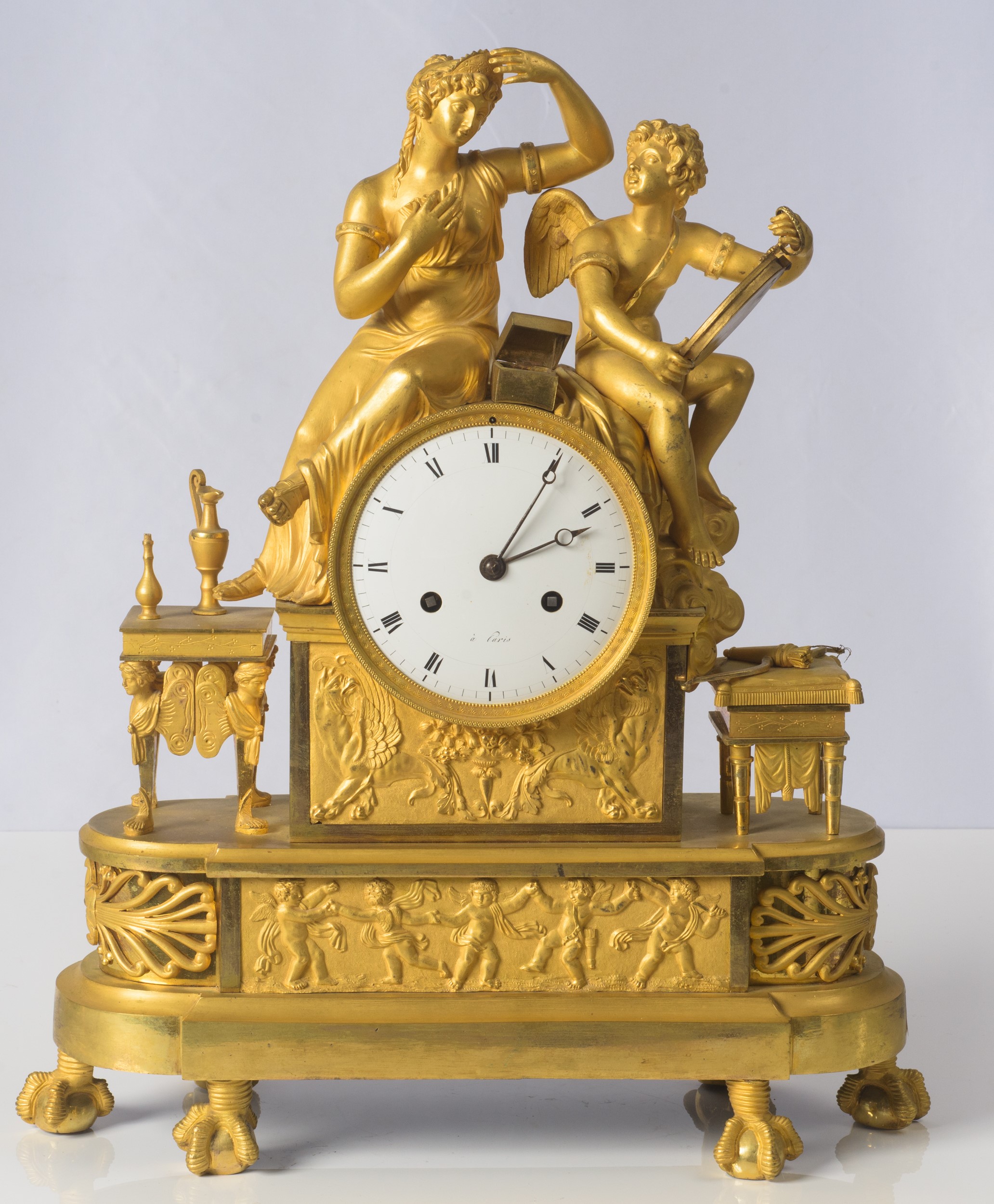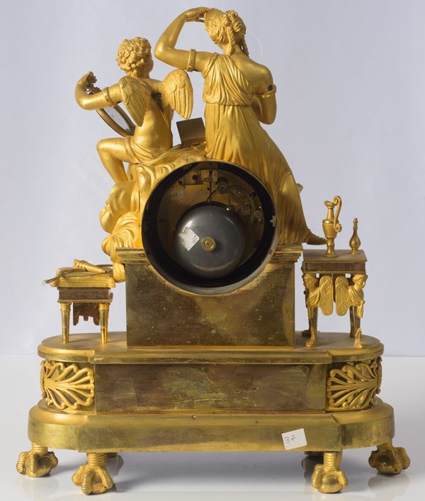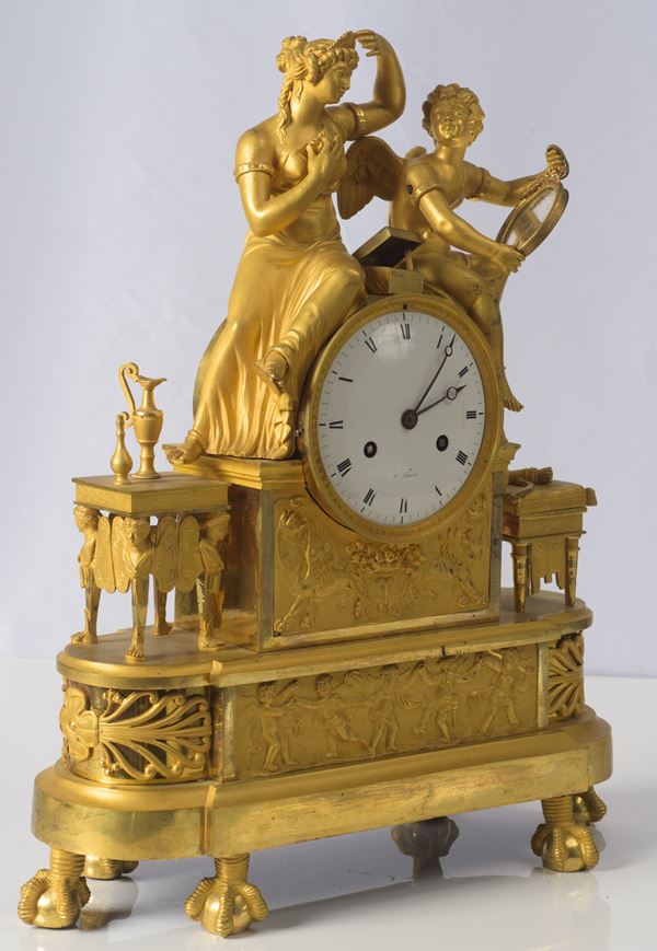 in bronzo dorato e finemente cesellato. Corpo centrale raffigurante la toletta di Venere. Quadrante smaltato con numeri romani. Firma parzialmente abrasa, Meccanica da revisionare.