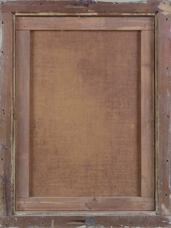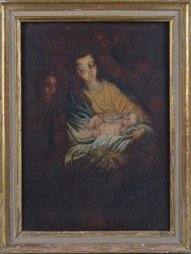La piccola tela raffigura la Vergine seduta in contemplazione del Bambino, che giace tra le sue braccia su un giaciglio di fieno, reso con cura luministica. Lo sguardo abbassato e assorto di Maria, il volto levigato e composto, insieme alla morbida resa delle carni infantili e ai panneggi controllati, rimandano ai modi di Paolo Girolamo Piola, figlio di Domenico e tra i protagonisti della pittura genovese tra Seicento e Settecento.