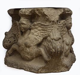 Di forma triangolare, con figura centrale raffigurante probabilmente una creatura fantastica, una sfinge con volto umano e corpo di uccello.