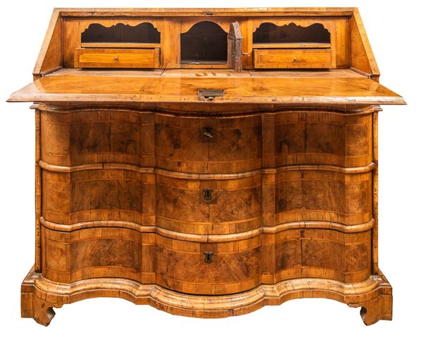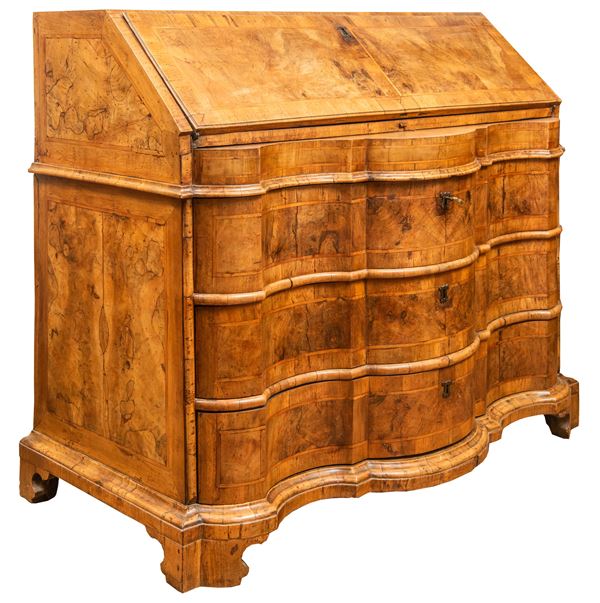 In legno di noce e radica di noce. Fronte centinato a tre cassetti con ribalta e cassettiera interna composta da due cassetti e scomparto centrale.